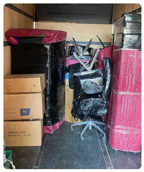 Büyük eşyalar (koltuk, dolap, masa vb.) streç film ve kalın pat pat ambalaj ile sarılır.